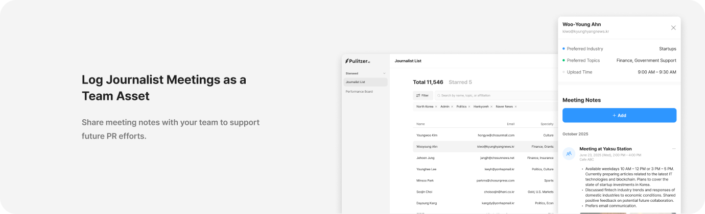 Need help identifying the right journalists in Korea? Pulitzer AI analyzes journalist coverage data and publishing patterns to help you target the right media.